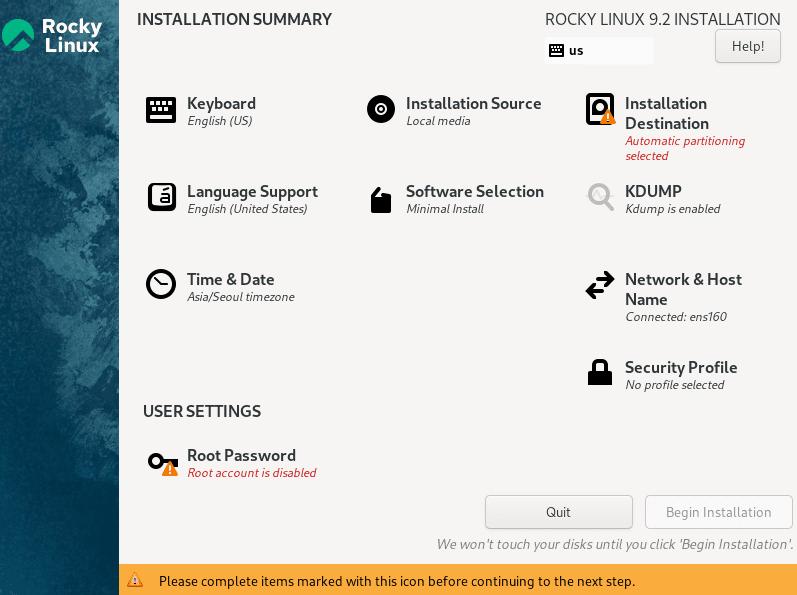 • Install Rocky Linux 9.2 선택 후 설치 진행