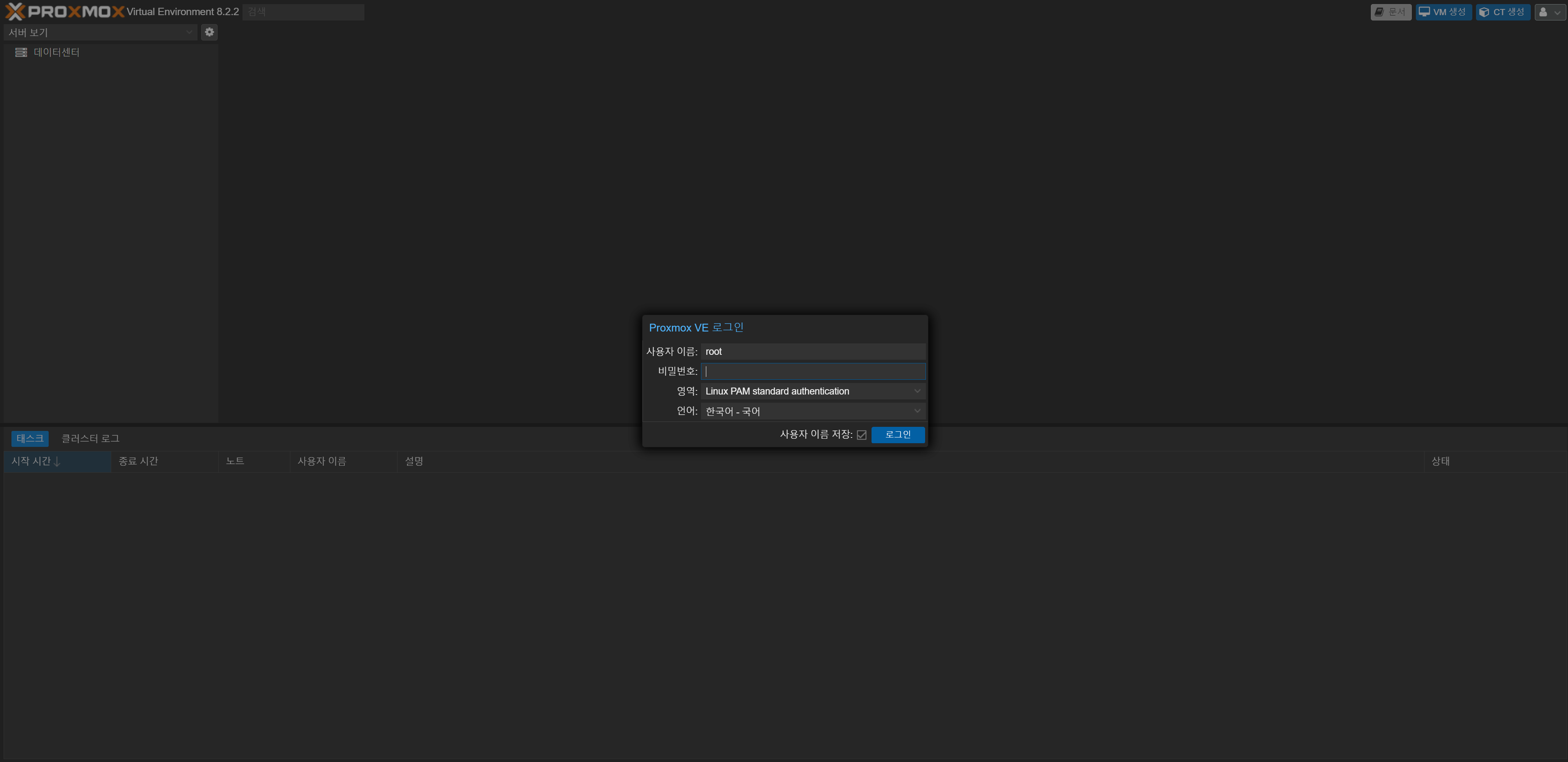 - https://Proxmox IP:8006으로 접속하시면 됩니다. 위에서 설정한 비밀번호를 입력 후 로그인