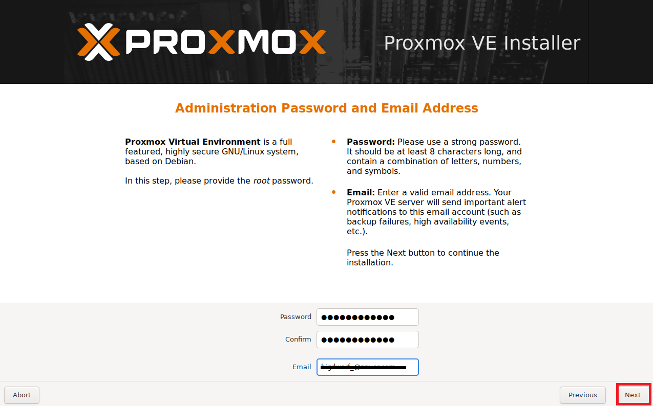 • 서버의 root 계정의 패스워드 설정하는 부분입니다. WebUI에서 사용하는 root의 패스워드로 사용됩니다. Proxmox 서버 이슈에 대한 내용을 메일로 받아볼 수 있습니다. 받아보실 이메일 계정을 입력해 줍니다. Next 클릭