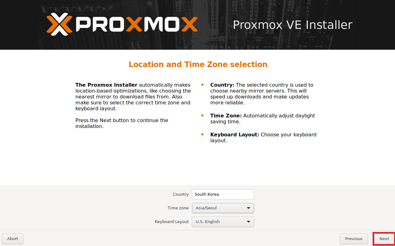 • Location and Time Zone 설정 국가 타임존 및 키보드 설정입니다. 저는 국가 South Korea 선택 키보드는 기본값(U. S. English)으로 진행하였습니다. Next 클릭
