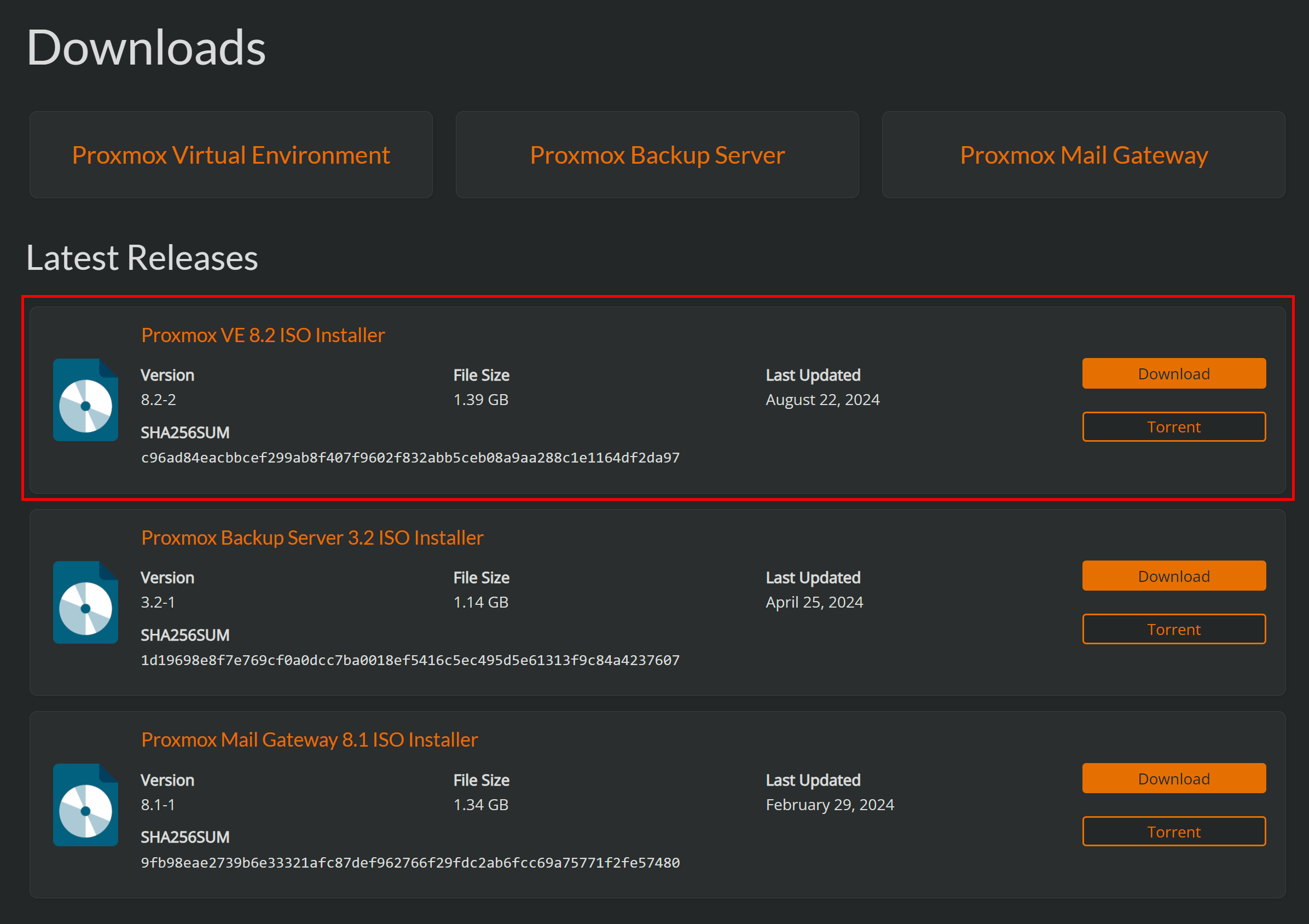 Proxmox VE 8.2 ISO Installer Version 8.2-2 File Size 1.39 GB Last Updated August 22, 2024 SHA256SUM c96ad84eacbbcef299ab8f407f9602f832abb5ceb08a9aa288c1e1164df2da97