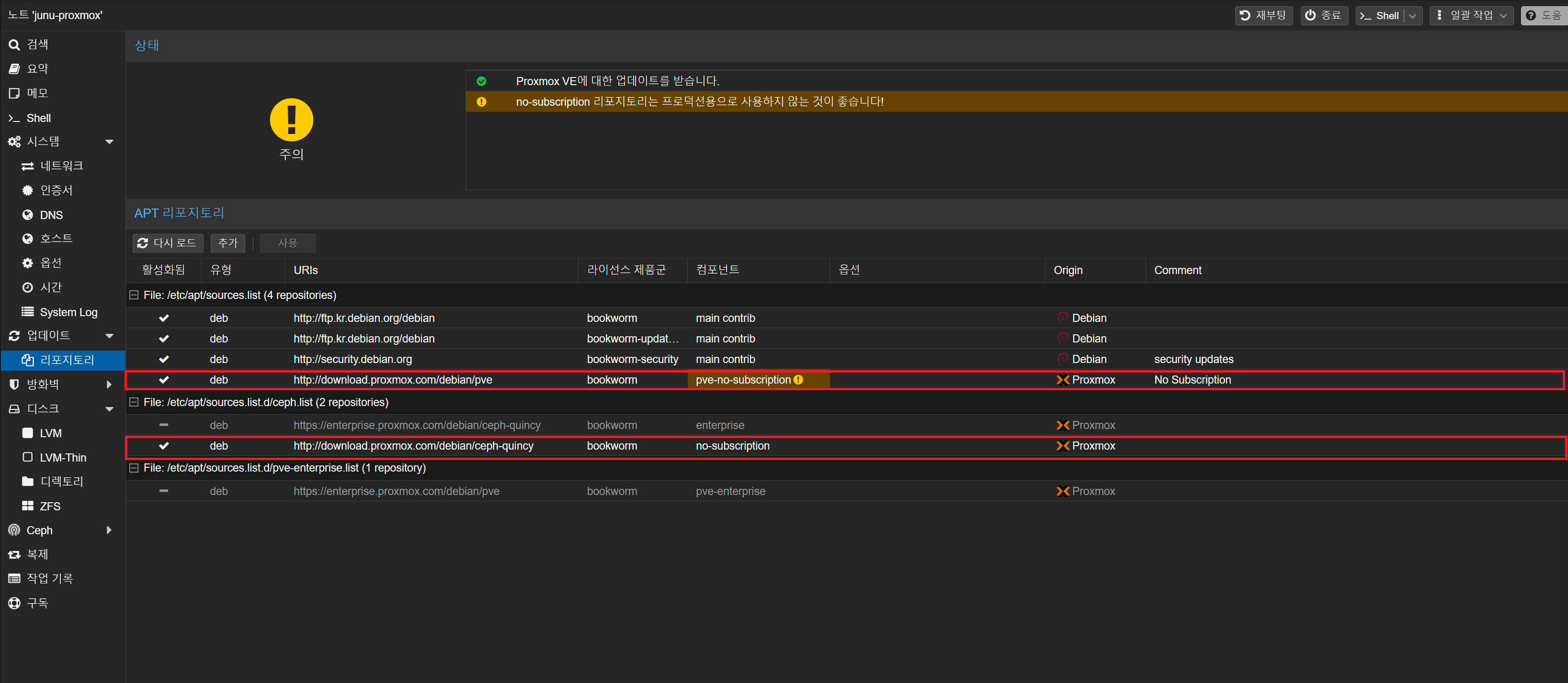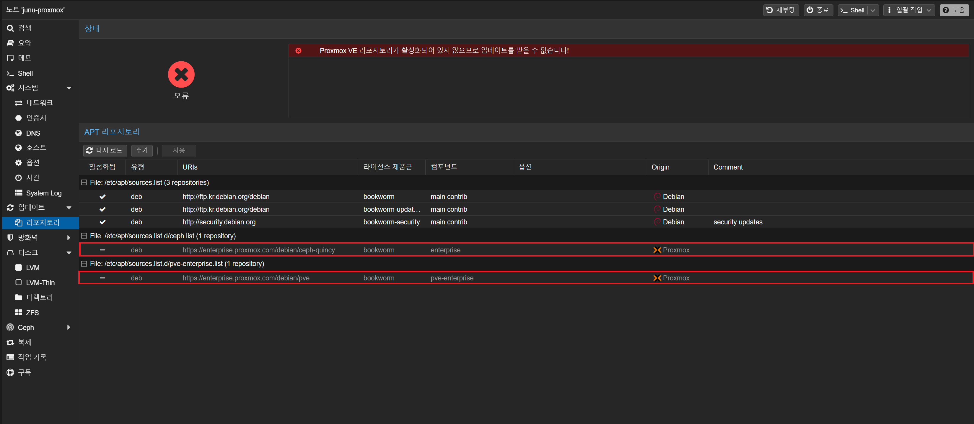 • /etc/apt/sources.list.d/pve-enterprise.list에서 enterprise를 주석 처리