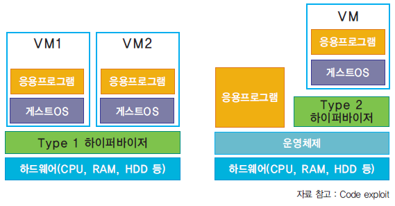 • Type 1 하이퍼바이저는 하드웨어에서 직접 하이퍼바이저가 실행되고 게스트 운영체제는 그 위에서 돌아가는 형태로, 게스트 운영체제가 하드웨어에서 두 번째 수준으로 실행된다.