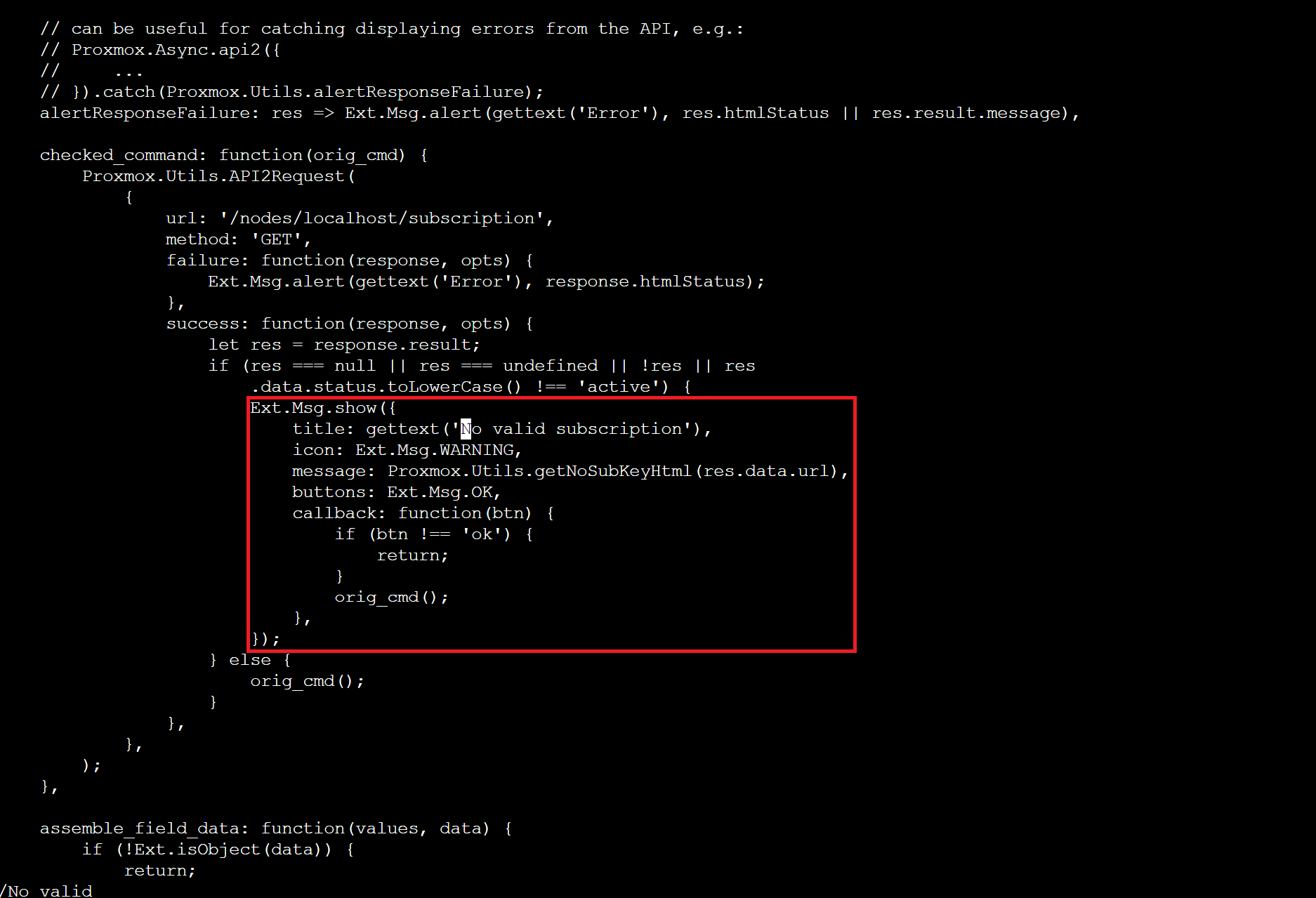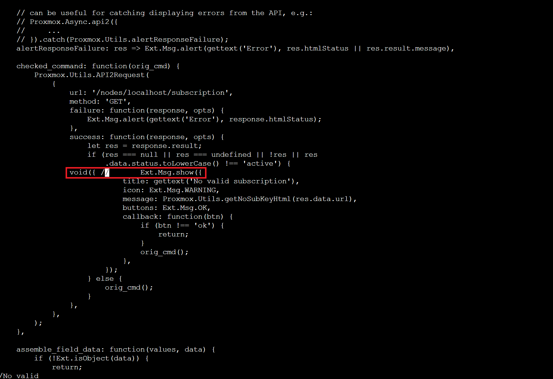 sed -i "s/\tExt.Msg.show/void/g" /usr/share/javascript/proxmox-widget-toolkit/proxmoxlib.js