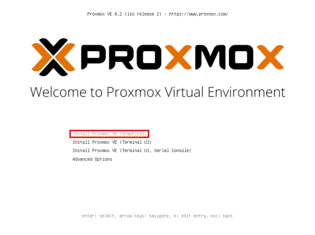 • Install Proxmox VE (Graphical)을 선택하여 설치를 계속 진행합니다. Proxomx GUI가 잘되어있기 때문에 CLI(Terminal UI)로 설치하실 필요는 없습니다. Install Proxmox VE (Graphical) 클릭