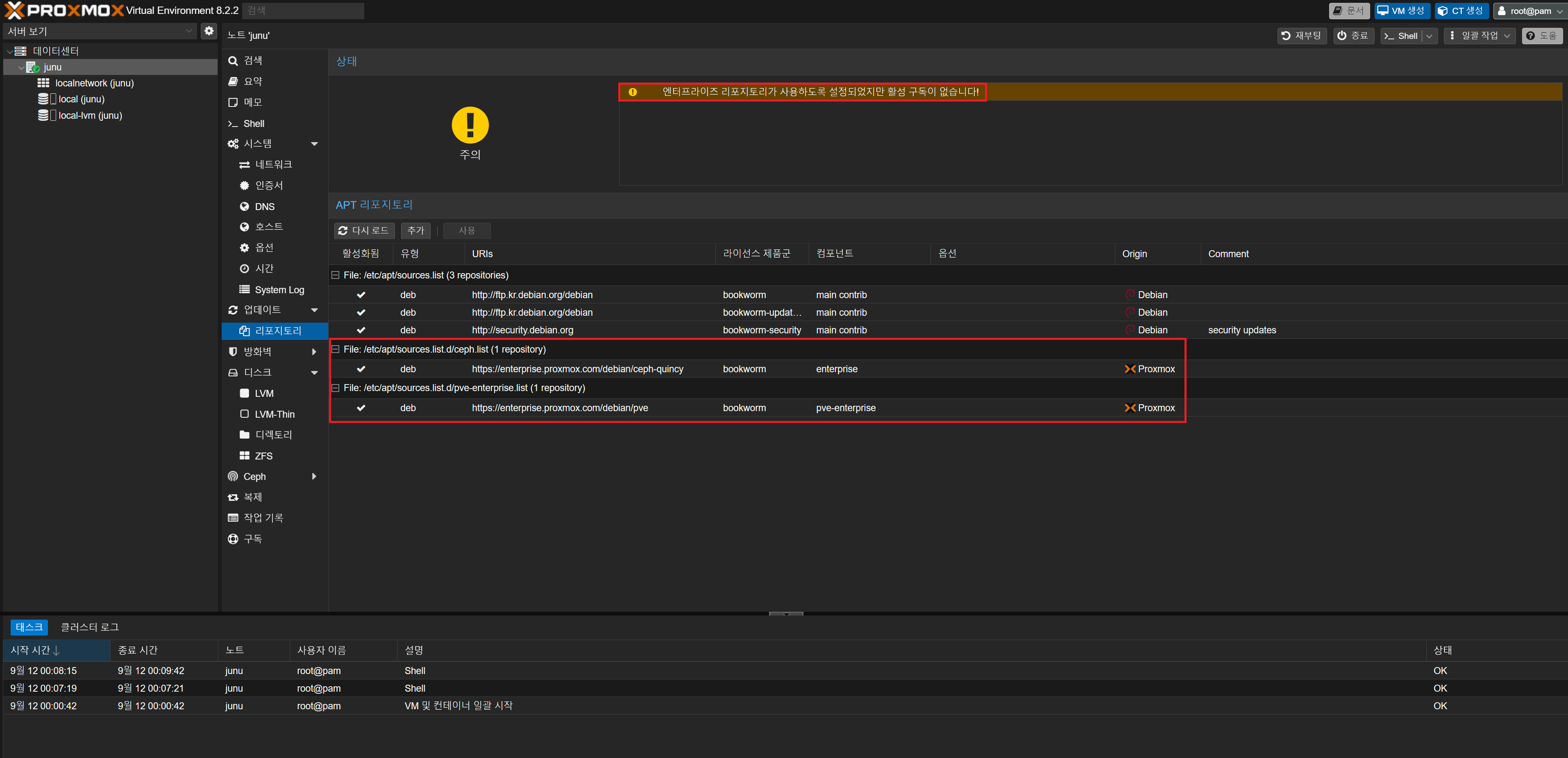• Proxmox WebUI 통해서 확인하시면 Enterprise 라이선스의 리포지터리가 포함되어 있는 것을 보실 수 있습니다.