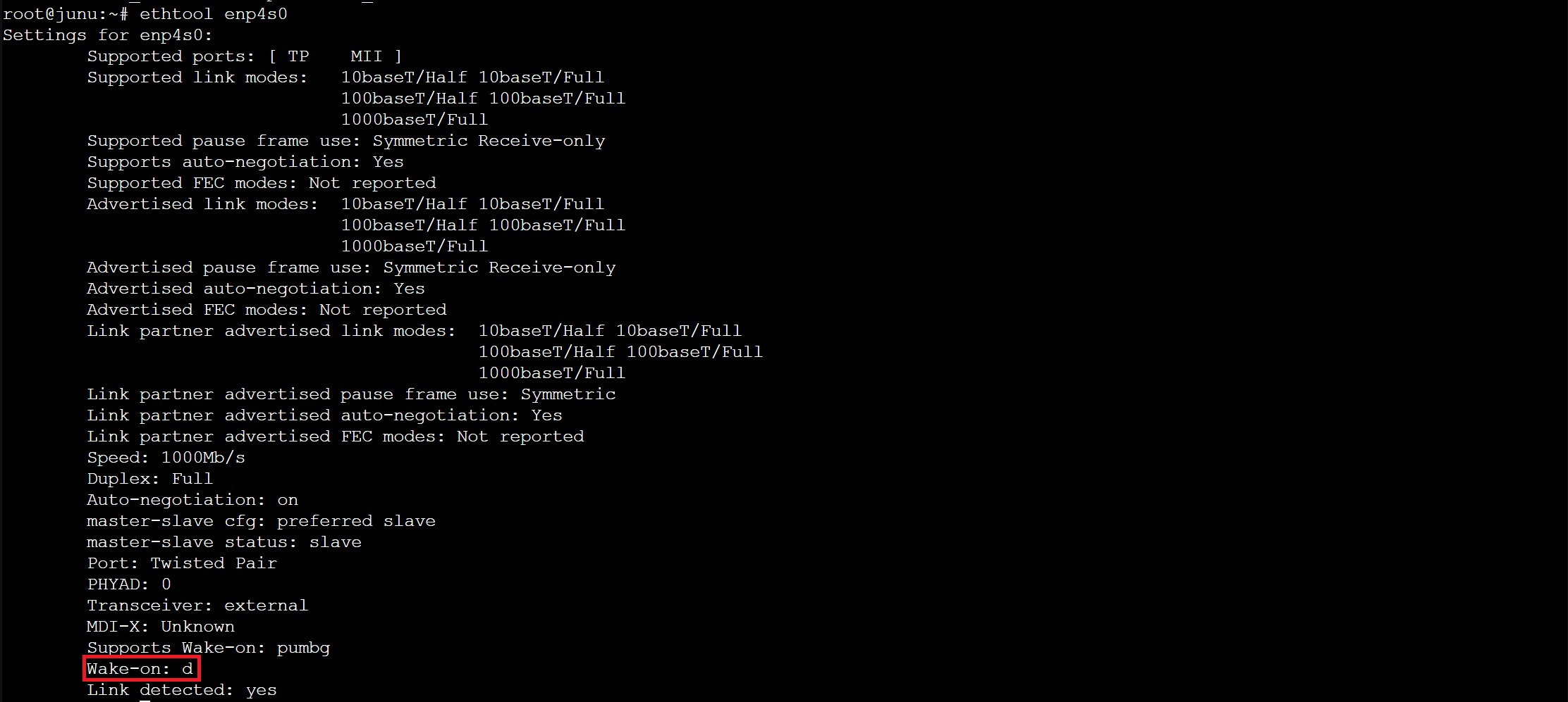 • 그리고 ethtool로 현재 랜카드 상태 확인 wake-on : d 인 것을 확인
