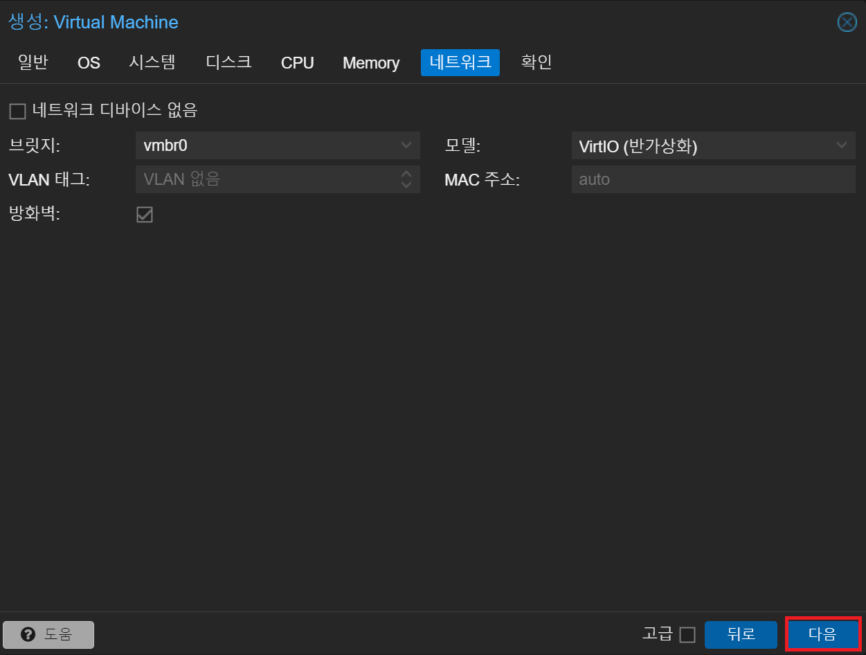 - 네트워크 부분은 디폴트 값으로 진행 다음 클릭
