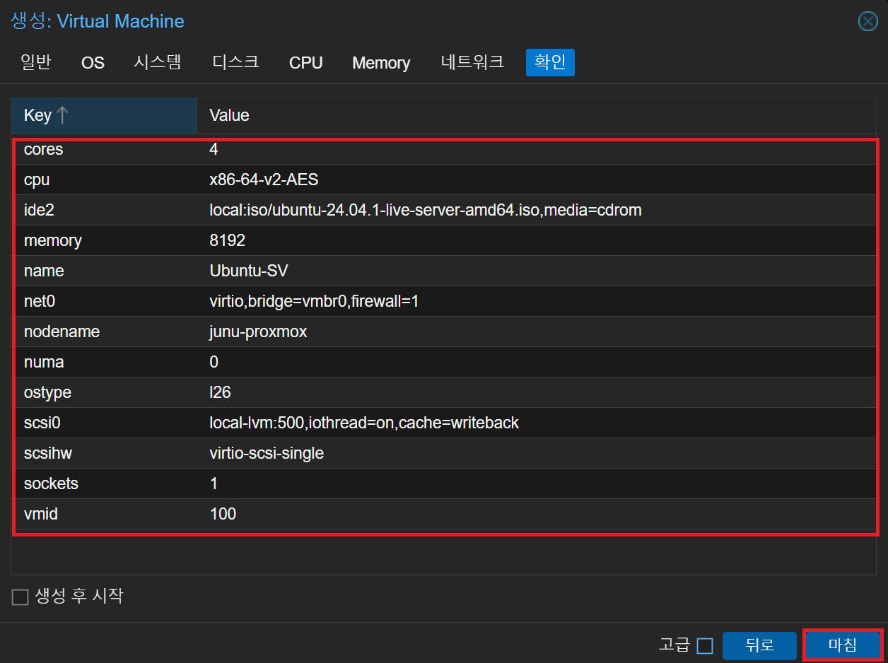 • 완료되면 오른쪽 데이터센터 부분을 보시면 생성된 VM 100(Ubuntu-SV)를 확인해보실수있습니다.